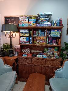 Il y a une pièce avec des tables, un buffet PLEIN DE JEUX DE SOCIÉTÉ à notre disposition gratuitement. Un endroit où on se sent bien dès l'arrivée. Libre à vous d'organiser une partie ou simplement jaser. On peut prendre un café (prix très compétitifs), de petites pâtisseries faites maison, des chocolats... Vous comprendrez qu'on ne peut pas apporter de breuvages ni nourriture.